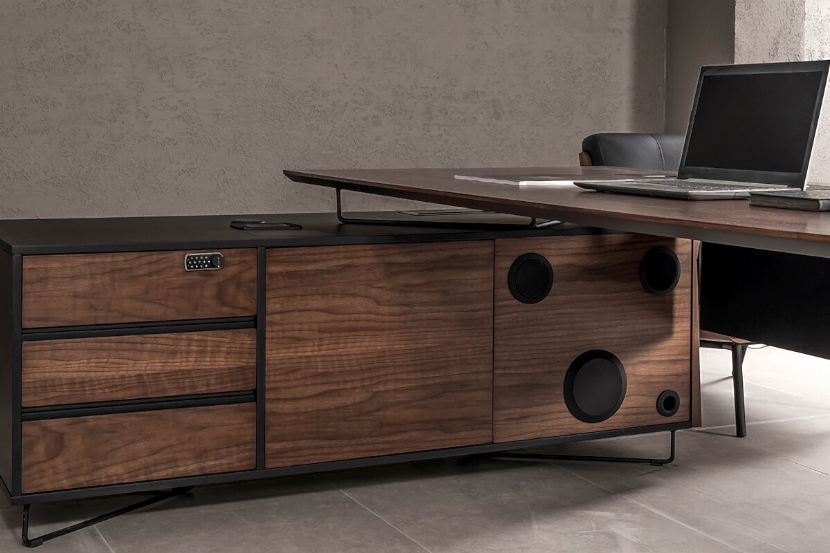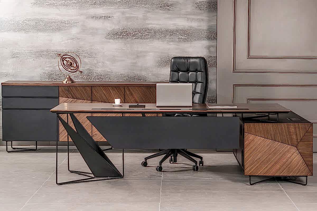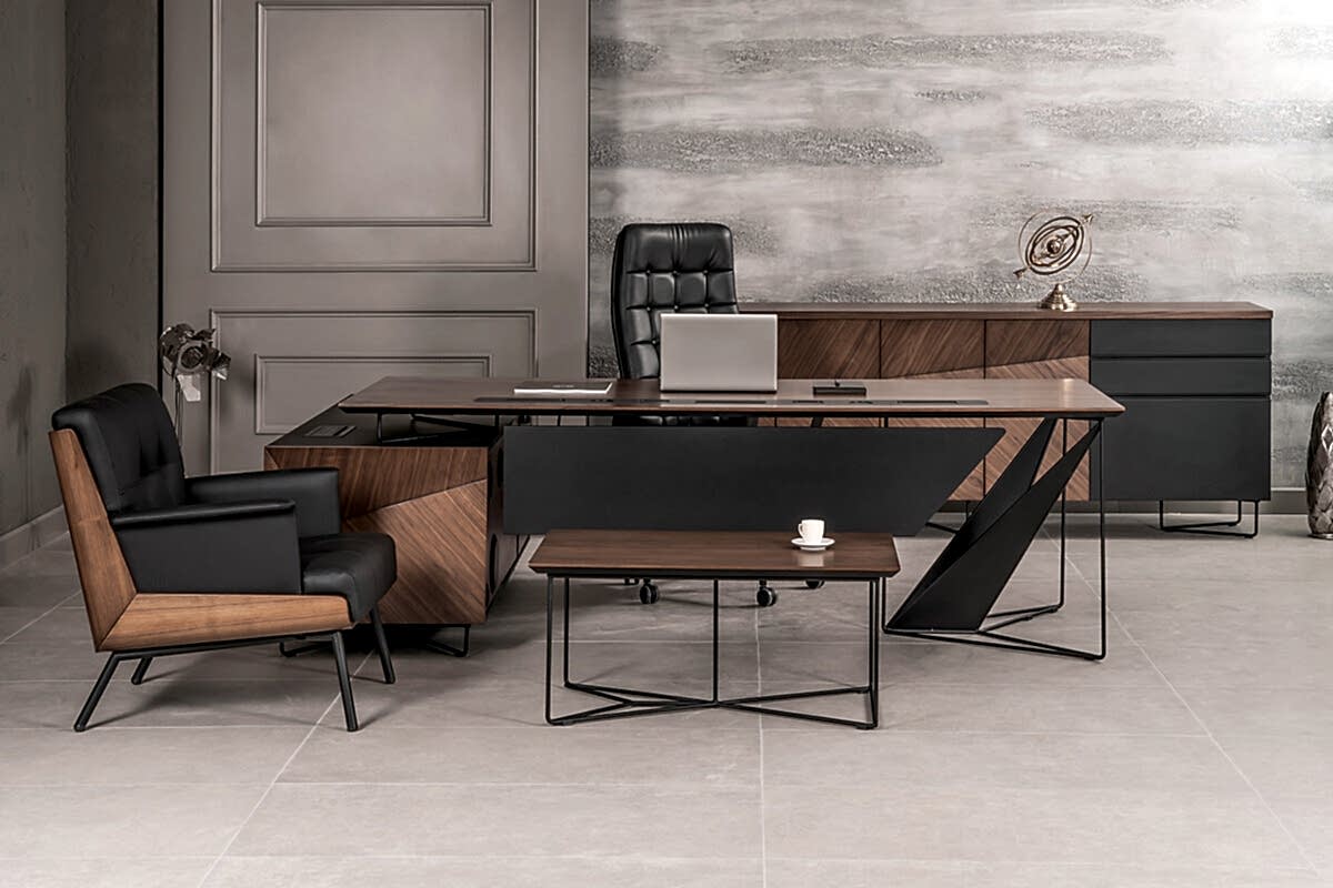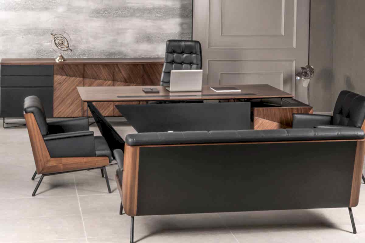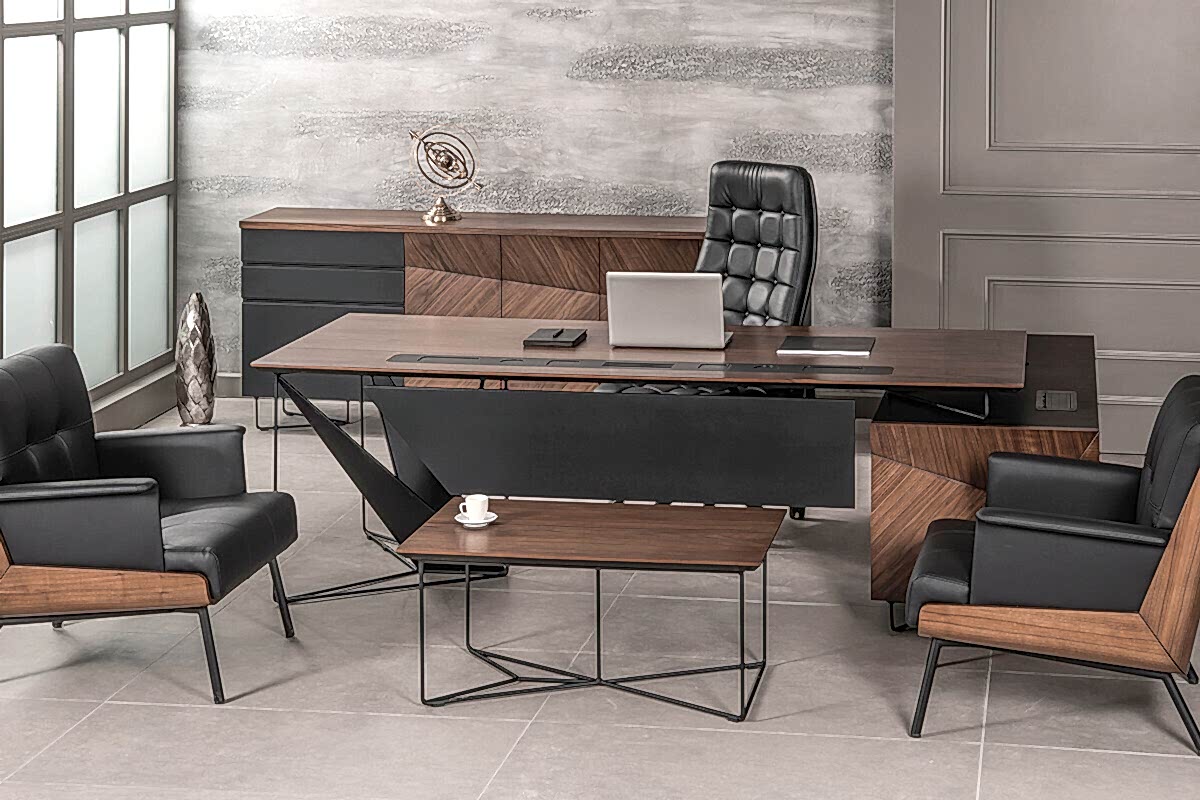 Ofis mobilyasında diğer bir göze çarpan unsur ise, ahşabın yanında detaylarda siyah tonuna yer verilmesi. Siyah, koyu ahşap rengine eşlik ederek takımda bir bütünlük sağlıyor. Ayrıca güçü ve gösterişi simgeleyen siyah, bu unsurları takımda fazlasıyla gösteriyor. Ofis mobilya takımı, şirket ortamında gücü ve ihtişamı göstermek için ideal olduğu bir gerçek.