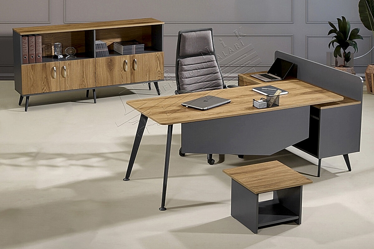 Bu müdür takımı, odanıza sofistike bir dokunuş katarken, kaliteli malzeme seçimiyle uzun ömürlü kullanım vaat eder. Dolabı ve zarif sehpasıyla birlikte eksiksiz bir çözüm sunan Nila, hem işlevselliği hem de estetiği ön planda tutan bir müdür mobilyası arayanlar için idealdir.