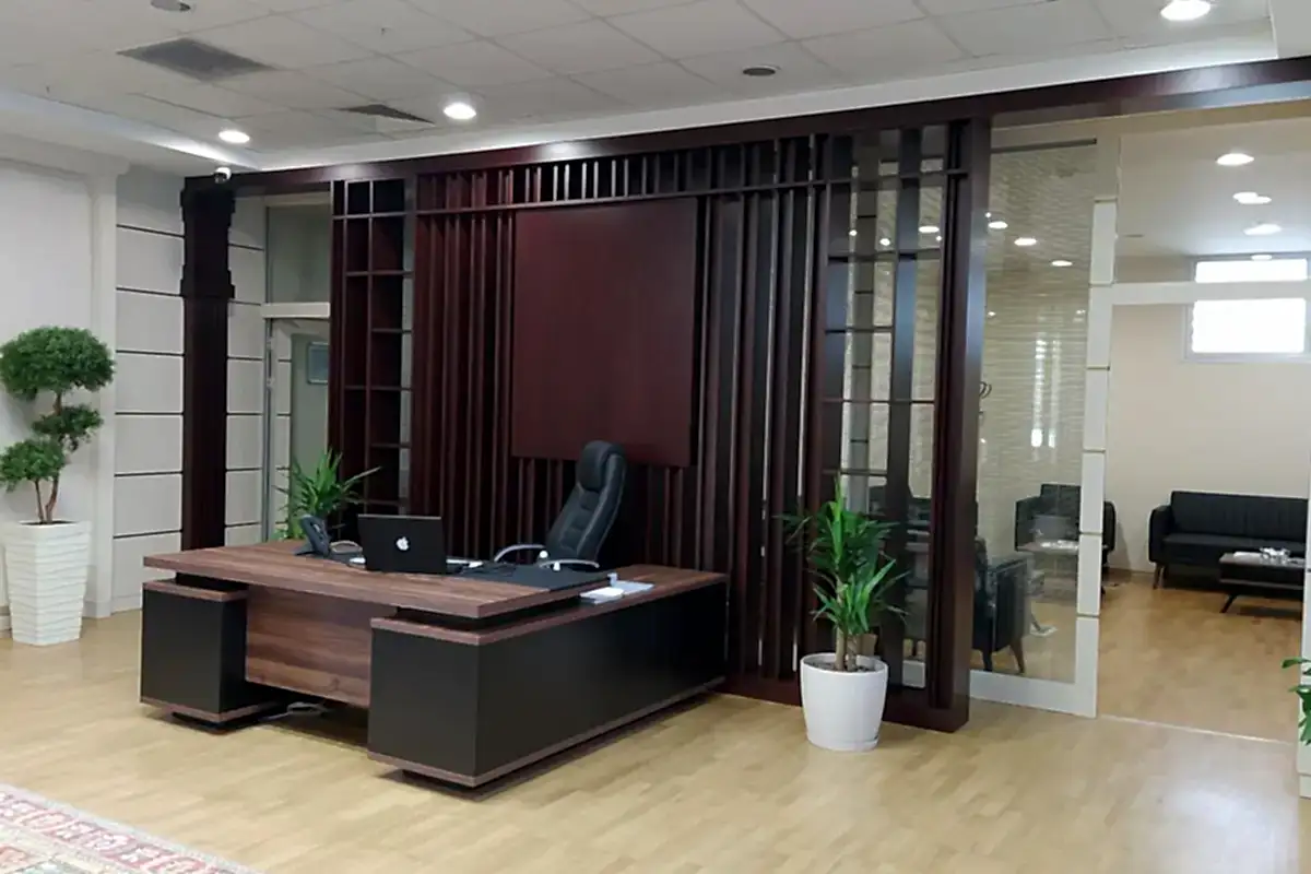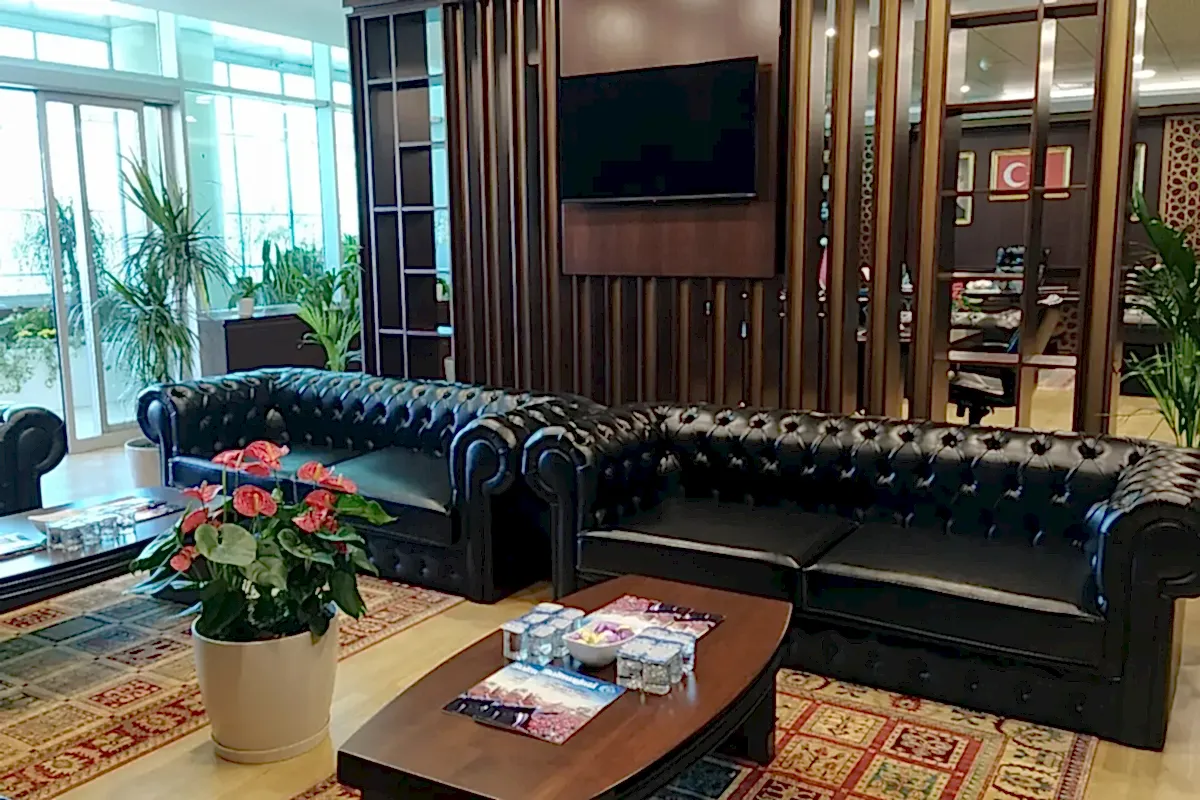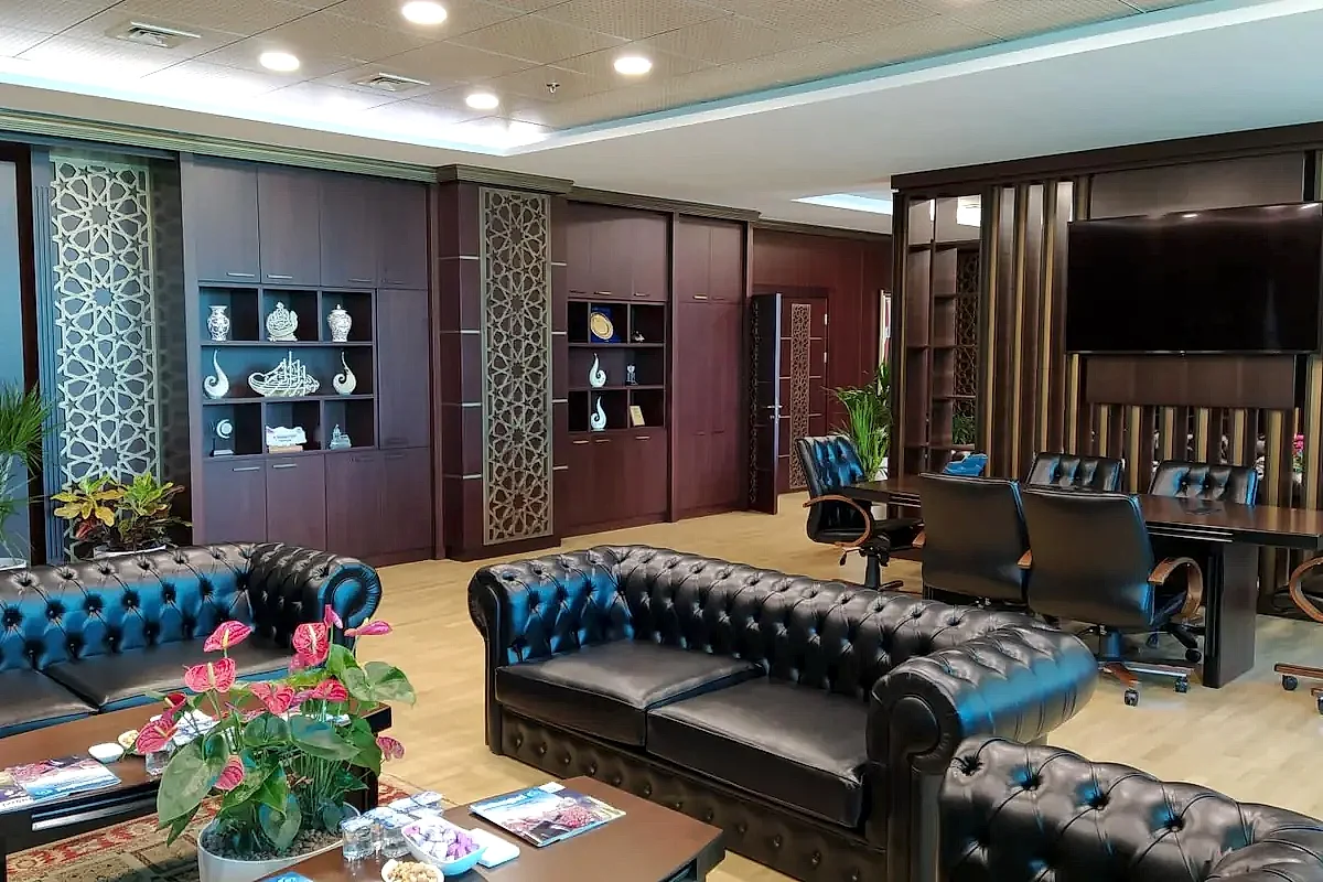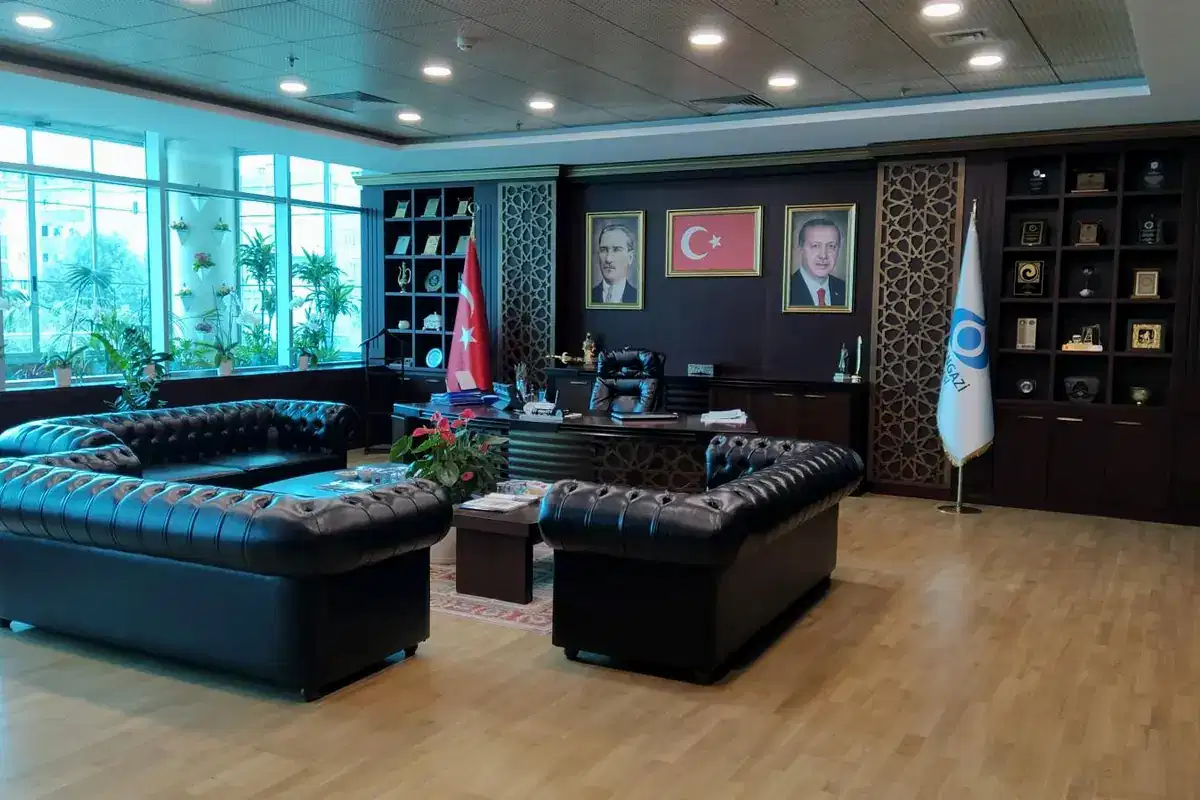 Belediye başkanlık makam odası için özel tasarım ofis mobilyaları uygulaması gerçekleştirildi. Proje kapsamında, makam odasında makam takımı, toplantı masası, TV ünitesi ve alan bütünlüğünü sağlayan bölme seperatör sistemi kullanıldı. Oturma alanlarında konforu artırmak amacıyla ofis kanepeleri tercih edilirken, duvar yüzeylerinde prestijli bir görünüm sağlamak için komple ahşap duvar giydirme uygulaması yapıldı. Ayrıca, fonksiyonellik ve estetiği bir arada sunan gömme niş dolap tasarımı projeye dahil edildi. Sekreterya alanında ise ziyaretçi trafiğini düzenleyen ve kurumsal kimliği yansıtan karşılama bankosu (sekreterya masası) uygulaması gerçekleştirildi.